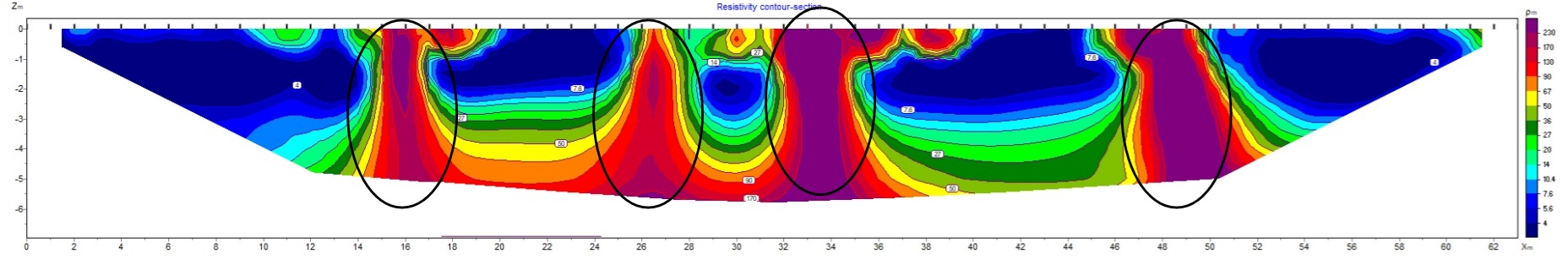 Indagine geoelettrica ad alta risoluzione in una via di un centro storico. Presente una sequenza di grotte con volte a circa 1 m da piano campagna. Il disturbo della massicciata non ha permesso di evidenziare la posizione della volta, ma sono ben evidenti le forme alte e strette che le caratterizzano.